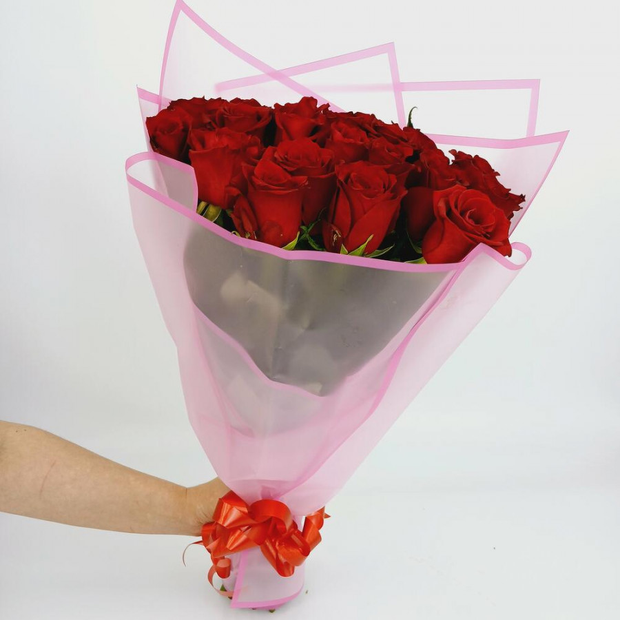 На фото букет из 21 бордовой розы. В составе: роза 21 шт, дизайнерская упаковка 1 шт, атласная лента 1 шт, . Все цветы свежие и ароматные, букет красиво оформлен и отлично подходит для подарка. Доступна доставка цветов или самовывоз.