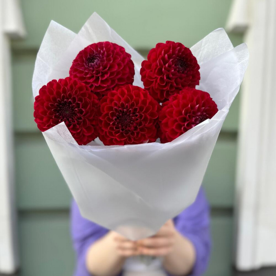 На фото букет из 5 красных георгин. В составе: георгина 5 шт, дизайнерская упаковка 2 шт, атласная лента 1 шт, . Все цветы свежие и ароматные, букет красиво оформлен и отлично подходит для подарка. Доступна доставка цветов или самовывоз.