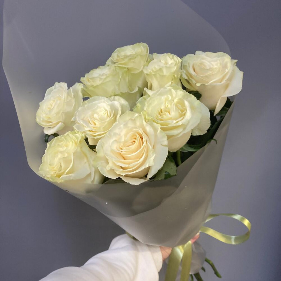 На фото букет из 9 белых роз. В составе: роза 9 шт, дизайнерская упаковка 1 шт, атласная лента 1 шт, . Все цветы свежие и ароматные, букет красиво оформлен и отлично подходит для подарка. Доступна доставка цветов или самовывоз.