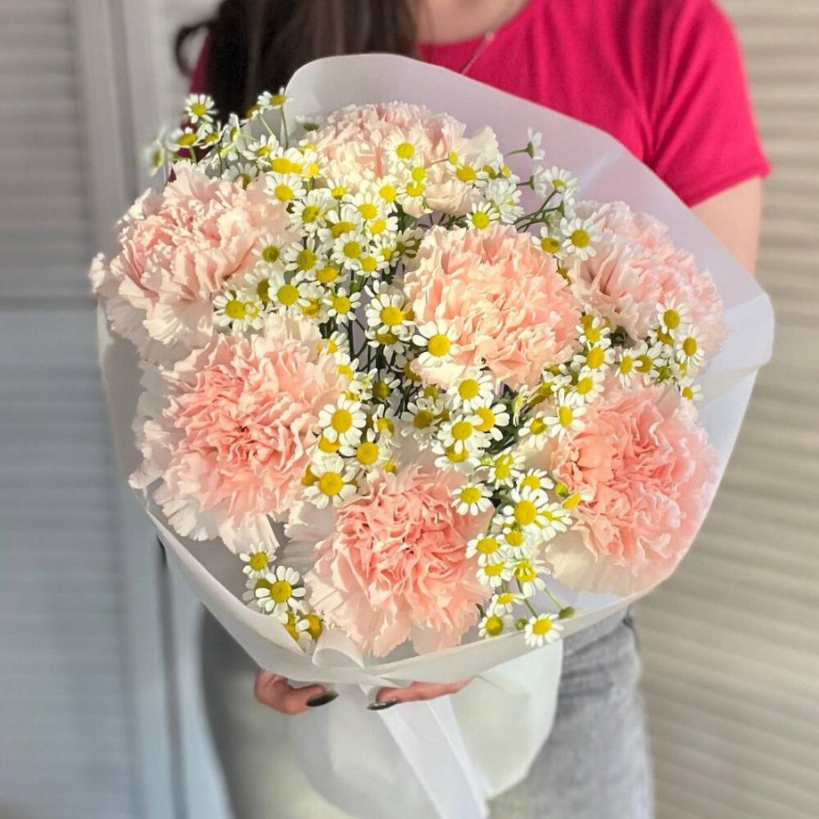 На фото букет «розовый пломбир». В составе: гвоздика 7 шт, танацетум 5 шт, дизайнерская упаковка 1 шт, атласная лента 1 шт, . Все цветы свежие и ароматные, букет красиво оформлен и отлично подходит для подарка. Доступна доставка цветов или самовывоз.