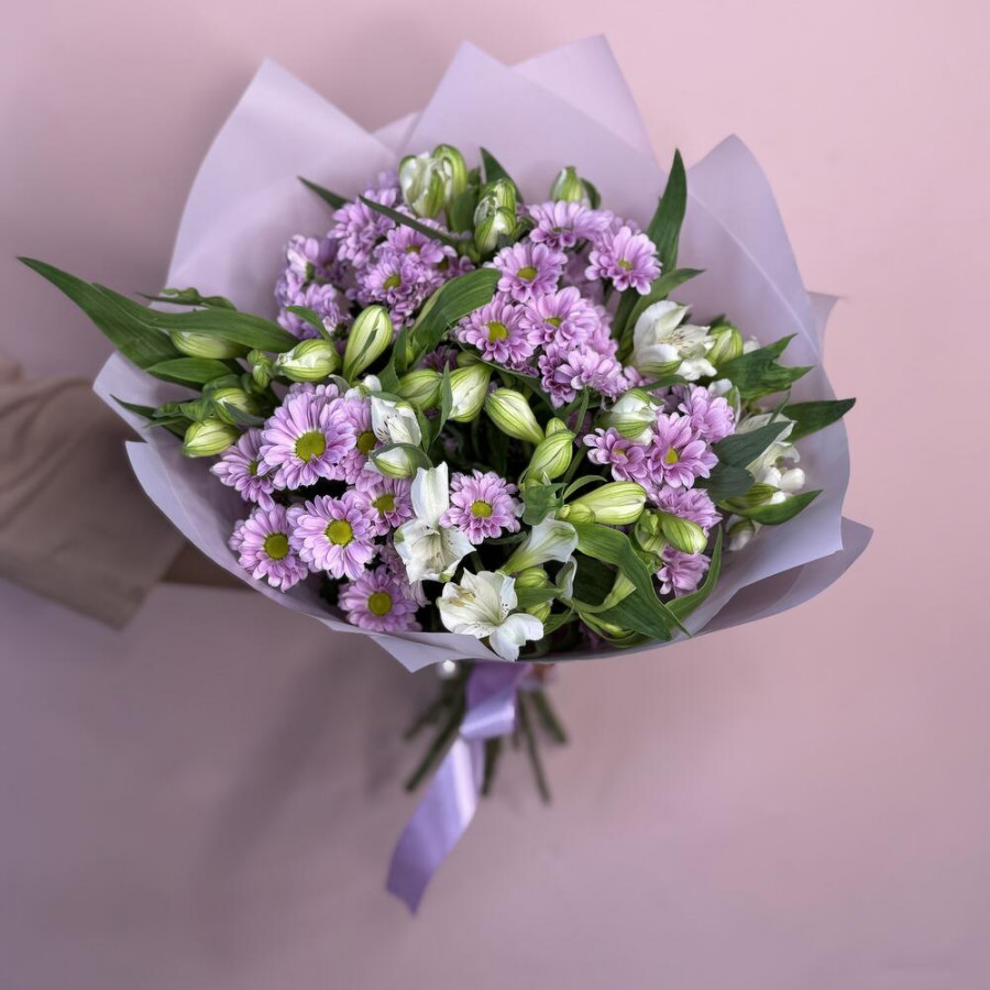 На фото букет «сиреневая соната». В составе: альстромерия 3 шт, хризантема кустовая 5 шт, дизайнерская упаковка 1 шт, атласная лента 1 шт, . Все цветы свежие и ароматные, букет красиво оформлен и отлично подходит для подарка. Доступна доставка цветов или самовывоз.